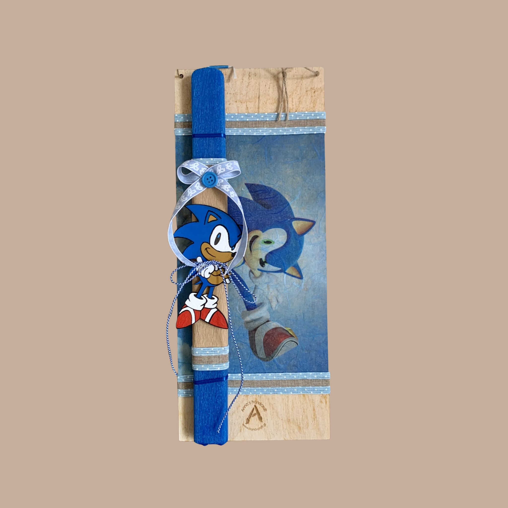 • Η Βάση-Κάδρο: Συνοδεύεται από μια χειροποίητη ξύλινη πλάτη στήριξης, φιλοτεχνημένη με την τεχνική του ντεκουπάζ και θέμα τον Sonic.