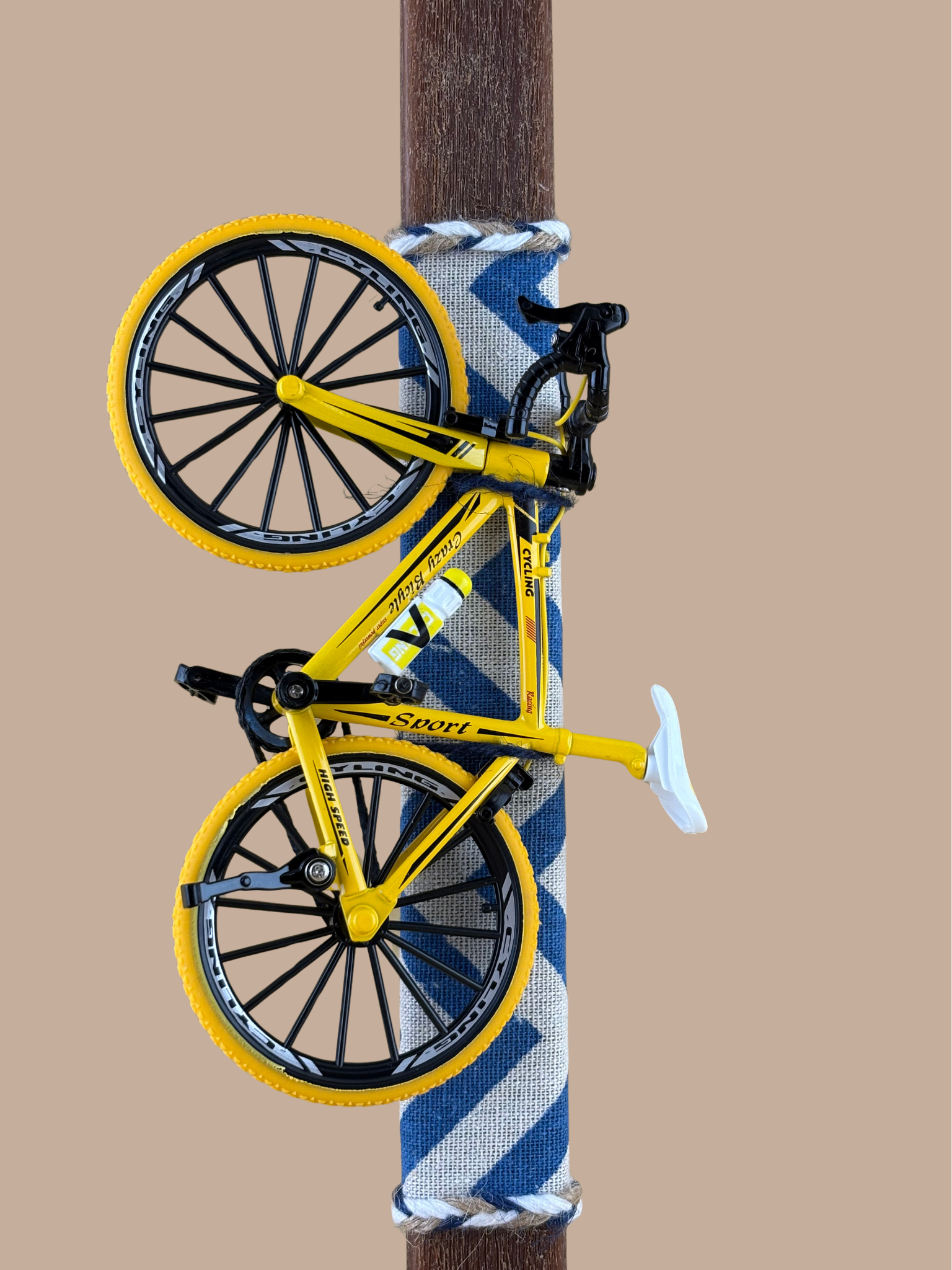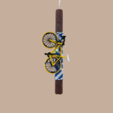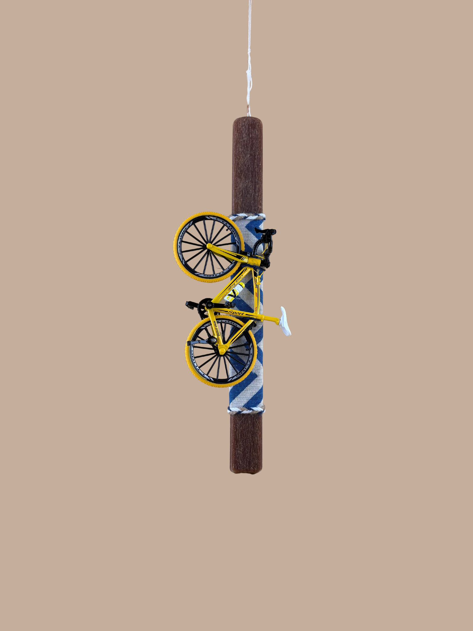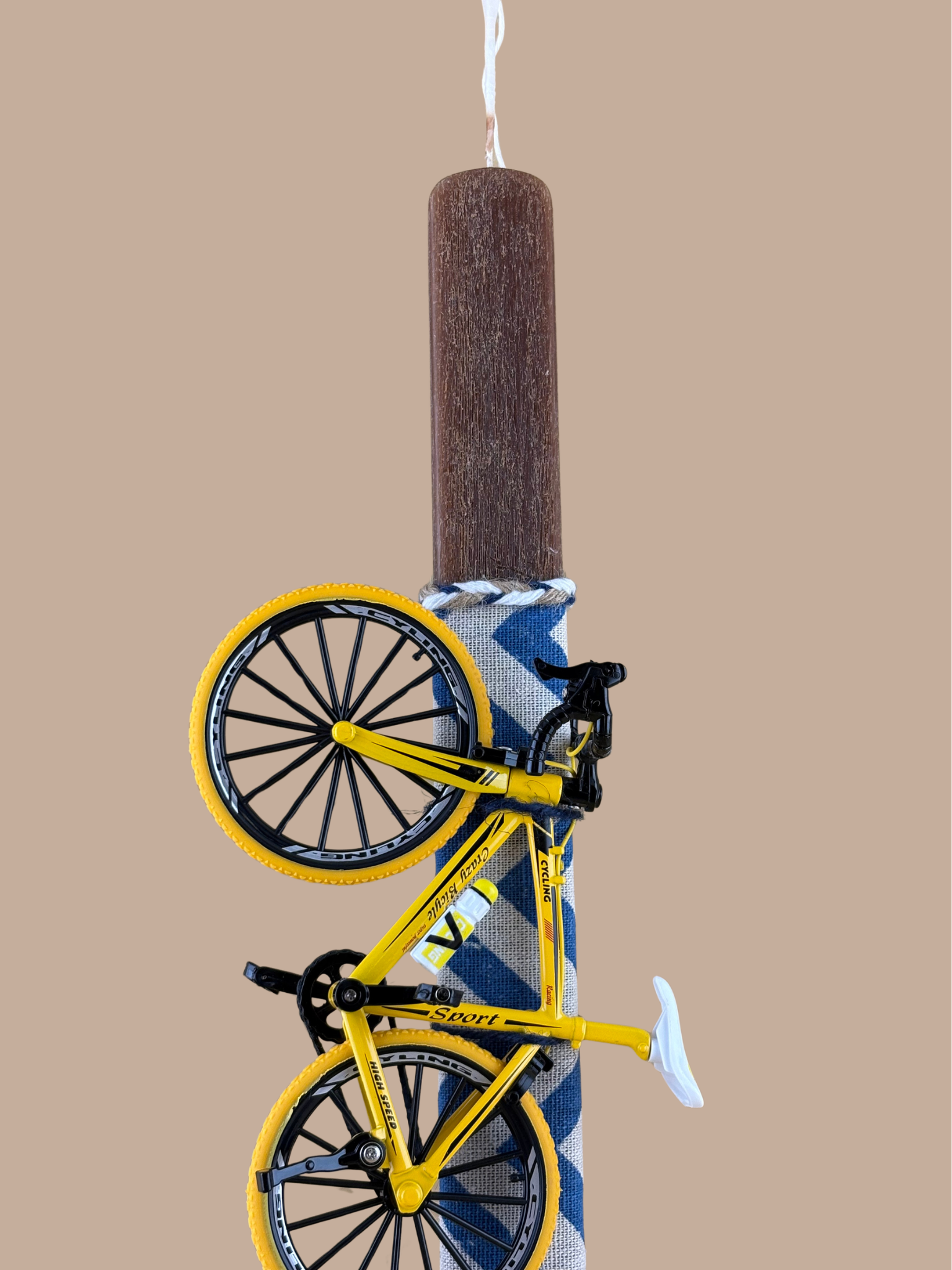 Δώστε “ταχύτητα” στο φετινό Πάσχα με τη λαμπάδα “Yellow Champion”. Το καφέ ξυστό πλακέ κερί 36 εκατοστών προσφέρει μια γήινη, vintage αίσθηση που αναδεικνύει τέλεια το έντονο κίτρινο χρώμα του ποδηλάτου-μινιατούρα. Μια επιλογή γεμάτη φως και ενέργεια, στολισμένη με προσοχή στη λεπτομέρεια, ιδανική για όσους αγαπούν τις εξορμήσεις και το αθλητικό στυλ. Το ποδήλατο παραμένει ως διακοσμητικό στο δωμάτιο μετά την Ανάσταση!